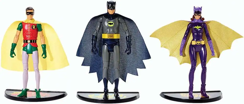 Bam! Pow! Whack! Recreate awesome action with this power pack of authentic figures from the beloved classic TV series. Favorite characters Batman, Robin and Batgirl are highly detailed, 6-inch figures with multiple points of articulation, iconic design and rendered in each actor’s likeness! Play out exciting battles with the Dynamic Duo and their favorite rebel with a cause Batgirl, or pose them dramatically and display them on the included bases with retro cool backdrops! These captivating premium figures are sure to delight both fans and collectors. Colors and decorations may vary.buy = ‘Y’;