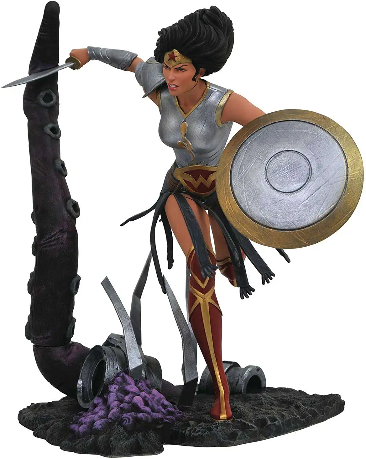 How metal is your Gallery? The world of Dark Knights: Metal expands with the latest comic-based DC Gallery diorama – Wonder Woman from the world of Batman: The Merciless! This woman warrior is girded for battle with breastplate and shoulder armor, and has her sword and shield at the ready. Sprinting past a monstrous tentacle, this action-packed 9-inch PVC diorama comes packaged in a full-color window box. Sculpted by Cortes Studio based on a design by Caesar!