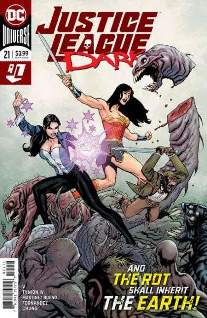 Rot ‘n’ roll! Wonder Woman, Detective Chimp, and special guest star Animal Man fend off a horde of monstrous Rot-infected creatures-but risk contamination with every soul they save! Meanwhile, Zatanna and Constantine discover the secret of the Parliaments in an estranged ally’s dreams, but there they find no lullabies-only nightmares!