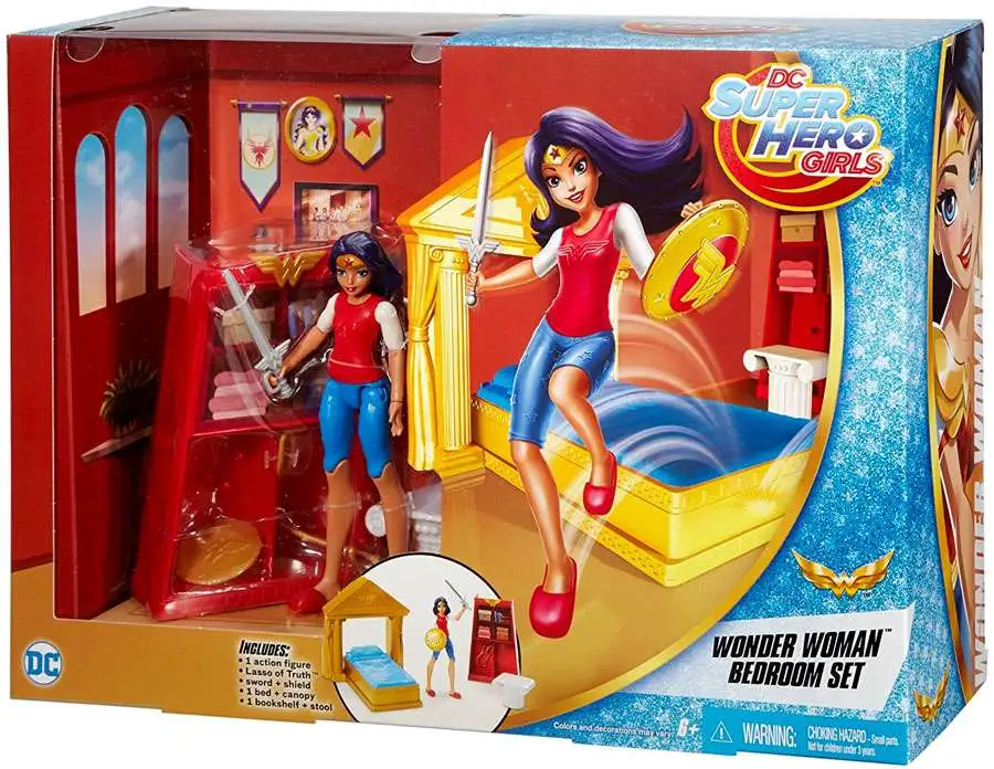Recreate the fun of attending Super hero high with these DC Super hero girls play sets that feature a 6-inch action figure and bedroom set. Choose from sets inspired by roommates wonder Woman or Harley Quinn. Each comes with a desk accessory that has a transformation feature, a chair, a bed and a headboard with characteristic colors and details. Smaller pieces add to the storytelling fun. The action figures are ready for action-packed dreams dressed in signature pajamas with an iconic Super hero accessory.