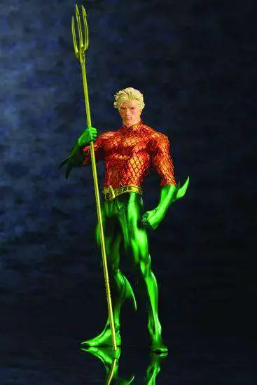 Kotobukiya’s line of DC Comics ‘New 52’ ARTFX+ Statues continues, capturing the new looks and costumes of heroes in the Justice League. Joining the previously released Superman, Green Lantern, Flash, and Wonder Woman is the half-Atlantean AQUAMAN! A former ruler of Atlantis who seeks to defend the world both above and below the waves, Arthur Curry is a powerful warrior and leader. While it has been revealed that he has had previous adventures with other teams, Aquaman’s first major public appearance in the relaunched New 52 continuity was in the pages of Justice League, joining the other heroes against Darkseid and his forces. The current incarnation of Aquaman makes the character larger than life, with strength, intelligence, and powers that make him a valued member of the Justice League. Arthur appears here in the ARTFX+ lineup with a fantastic representation of those heroic ideals, standing with all of the quiet grace of an otherworldly ruler. Aquaman’s iconic costume is captured with every fine detail from the intricate overlapping scales of his metallic orange armor to the creases and pointed fins on his green pants and gloves. The muscular aquatic hero holds his mighty trident in his right hand, calmly staring down the threats arrayed before him from under his wavy blonde hair. Standing nearly 8 inches tall (in the ARTFX+ 1/10th scale),