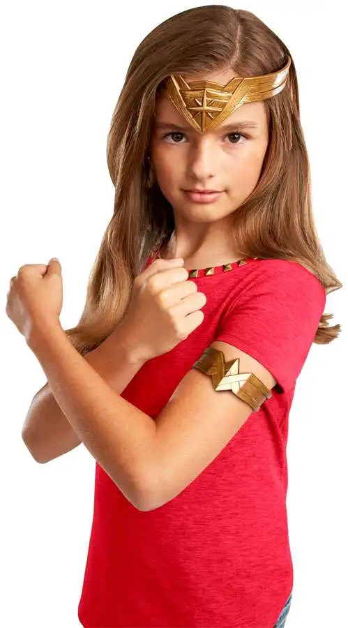 Become Wonder Woman with her signature headdress and arm band! Both Amazon Warrior accessories feature authentic, true to movie details and emblems! Fans can recreate the epic scene when she receives the iconic headdress and indestructible armband and play out favorite action battles! Put them on and feel like a Super Hero!