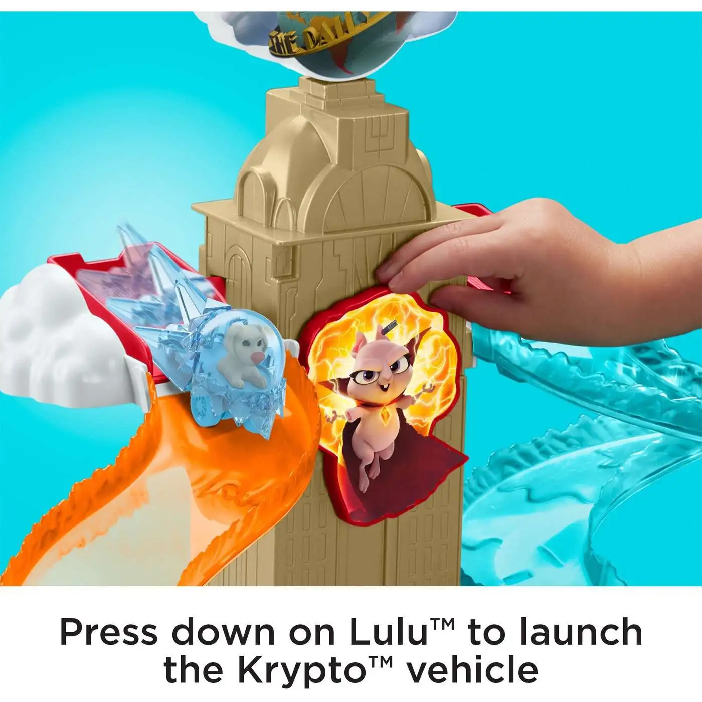 Preschoolers can recreate the high-speed action of their favorite Super Heroes pets with this awesome Daily Planet die-cast playset. Includes a die-cast vehicle. Choose which side of roads do you want to fight, ice or fire! Place the vehicle at the top of the playset and press Lulu down to launch it. The vehicle will move through the route on either side of the playset, reaching tabs decorated with guinea pig villains at the base!