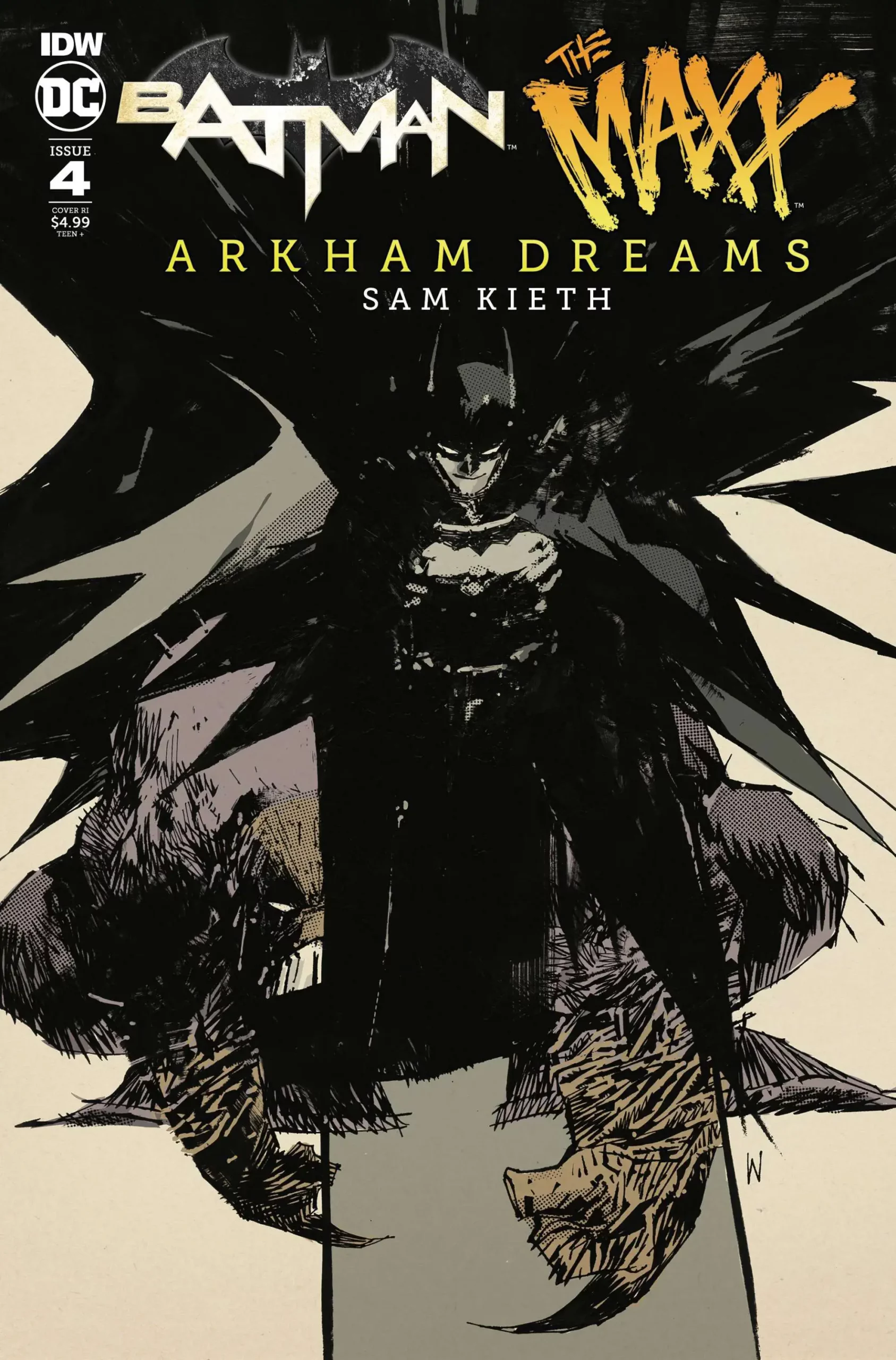 Midnight, the witching hour. Arkham is the scariest and most dangerous place in Gotham on a good day… but when the power is suddenly cut… super-sophisticated magnetic locks are now useless… and the worst inmates are released! Meanwhile, in the bowels of Arkham, Dr. Disparu has added the Riddler and Killer Croc to his insane plot to uncover Batman and The Maxx’s hidden secrets, buried deep in their inner psyches known as “Outbacks.” The plot thickens, and so does the tension, as Disparu’s secrets are finally revealed!